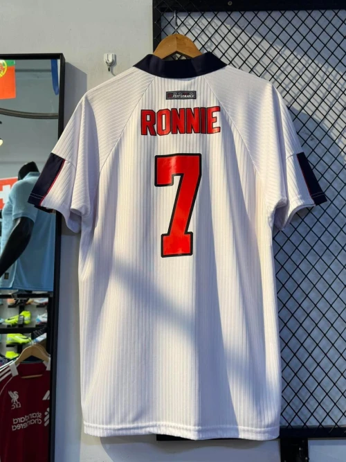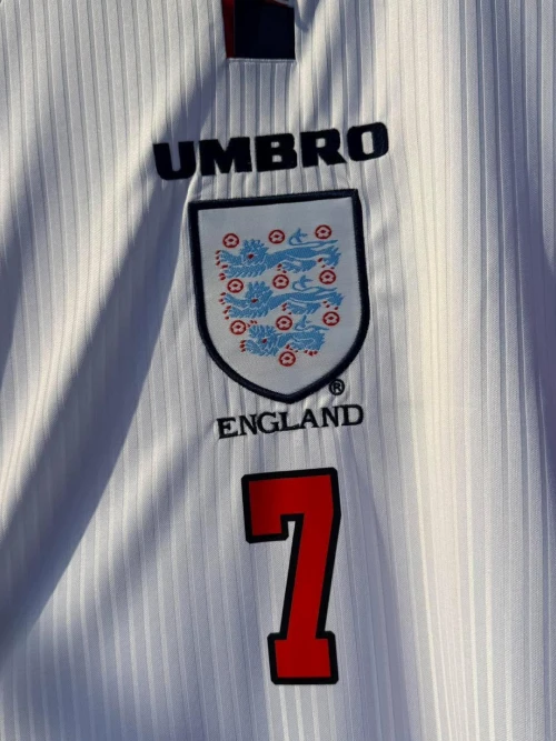 The England 1998 home kit, manufactured by Umbro, is an iconic football strip worn at the World Cup in France. It is known for its classic design, which features a crisp white base with subtle pinstripes.