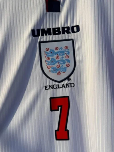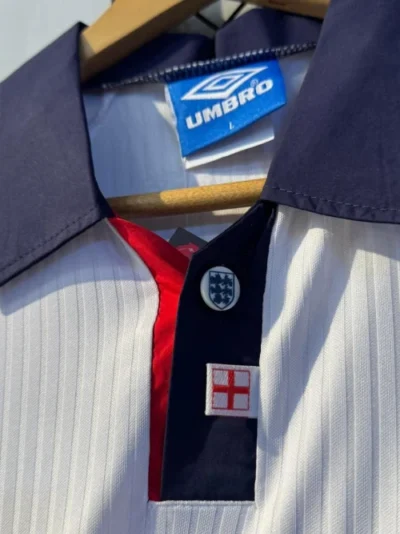 Collar: The navy blue, polo-style collar is a distinctive feature, with a smaller St. George’s Cross and the Umbro logo. The crest is embroidered on the chest, often with a miniature St. George’s flag on the collar.