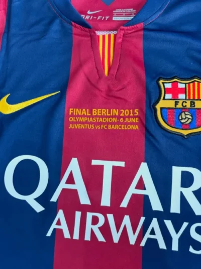 The FC Barcelona 14/15 home kit by Nike was worn during one of the most successful seasons in the club’s history, in which they won the continental treble (La Liga, Copa del Rey, and Champions League). The iconic jersey is especially memorable as it was the first season the attacking trio of Lionel Messi, Luis Suárez, and Neymar played together.
