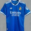 Fit and Details: It has a classic white crew neck, white Adidas stripes running down the shoulders, and the words “Real Madrid” printed on the back of the collar insert.