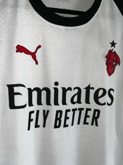 The 2025-2026 AC Milan away kit, produced by PUMA, is primarily white and incorporates red and black accents to maintain the club’s traditional colors.