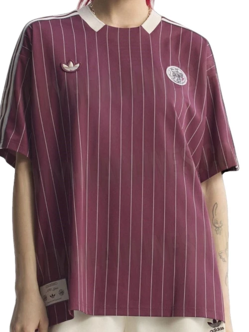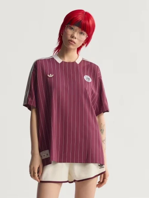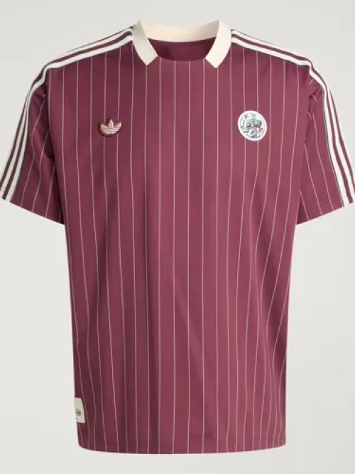 The jersey in the image is the Adidas Ajax Amsterdam Terrace Icons Jersey in the “Victory Crimson” color.