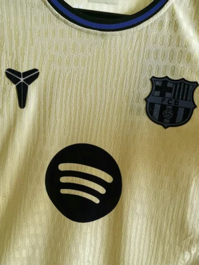 Kobe Sheath logo: For the first time in FC Barcelona’s history, the Nike Swoosh has been replaced on an official team jersey by another Nike sub-brand’s logo. The Kobe Sheath logo is featured prominently on the chest, along with the team crest and the Spotify sponsor logo.