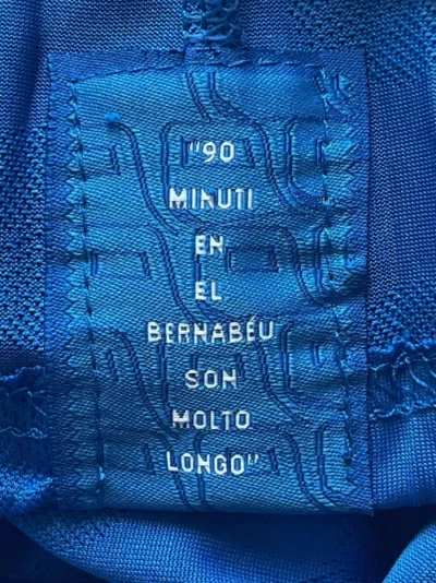 Inner collar sign-off: The authentic versions of the jersey include a special sign-off on the inside collar. It reads “90 minuti en el Bernabéu son molto longo,” a famous saying by Real Madrid legend Juanito, which means “90 minutes at the Bernabéu is a very long time”.
