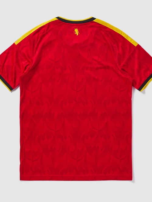 • Color Scheme: The jersey has a deep red base with striking gold and black details. It also features accents of yellow, a nod to the colors of the Belgian flag.