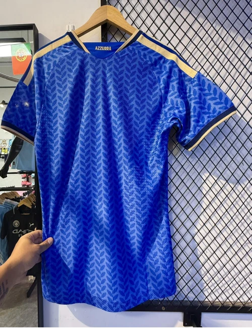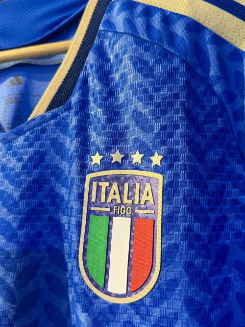 The Italy 2026 World Cup home kit, made by Adidas, is bold blue with gold detailing and a laurel leaf pattern to commemorate the 20th anniversary of Italy’s 2006 World Cup victory.