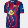 Spain’s 2026 World Cup home kit, designed by Adidas, features a classic red base with navy sleeves and fine yellow vertical pinstripes.